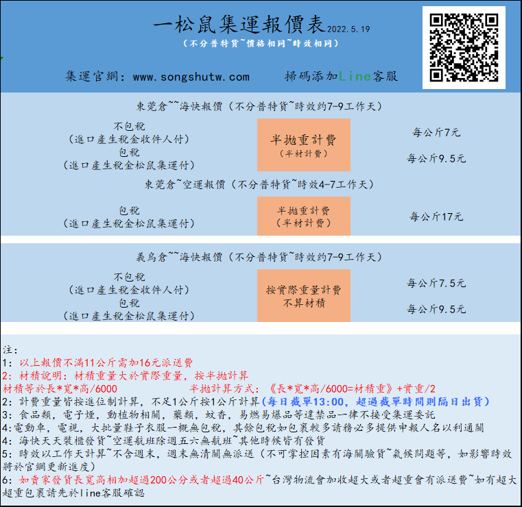 自7月21號開始,空運將使用半拋重計費,報價不變,僅改變計費方式