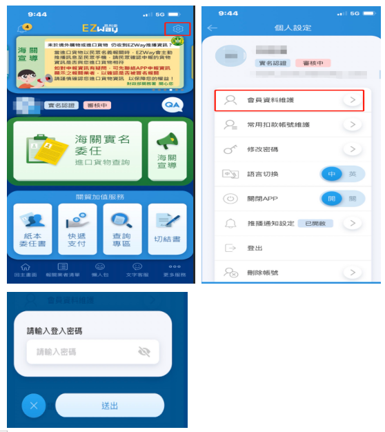 1. 進入實名APP程式,設定→會員資料維護→輸入 登入密碼